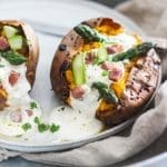 Piekst mit einer Gabel mehrmals in die gewaschen Süßkartoffel, reibt diese mit Olivenöl ein, legt sie dann auf ein Rost und schiebt sie in den Ofen; gebt ein mit Backpapier ausgelegtes Blech darunter, da die Süßkartoffeln tropfen. Backt die Süßkartoffeln für 50 Minuten.