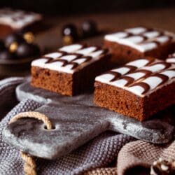 Verteilt den Zuckerguss auf dem Boden und verstreicht ihn gründlich. Füllt die Schokolade in einen Spritzbeutel und spritzt sie in einem dünnen Strahl an der kurzen Seite von oben nach unten. Nehmt einen Holzspieß und zieht parallel zur langen Seite durch die Schokolade, so dass das typische Muster entsteht.Lasst den Guss fest werden und serviert den frischen und saftigen Gewürzkuchen.