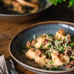 Nehmt mit einem Schaumlöffel die Mehlknödel aus dem Wasser. Jetzt kommt noch die gehakte Petersilie in die Sauce und dann kann schon angerichtet werden.