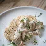 Löscht mit dem Zitronensaft ab und rührt danach die Vollmilch und den Schmand vorsichtig unter die Pilze. Jetzt kommt noch die gehackte Petersilie dazu und schmeckt mit Salz und Pfeffer ab.