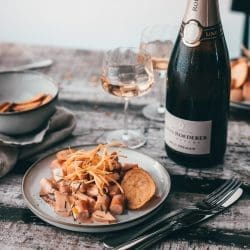 Erhitzt das Frittierfett auf 180 °C in einem höheren Topf. Schält währenddessen die Kartoffeln. Reibt eine davon zu langen und feinen Julienne, die andere in hauchdünne Scheiben. Trocknet sie auf Küchenkrepp, damit das Fett nicht zu sehr sprudelt, wenn ihr jeweils eine kleine Menge an Julienne aufnehmt und im Fett frittiert.Sobald das Kartoffelnest goldbraun ist, gebt es mit einem Schaumlöffel auf Küchenkrepp und lasst es auskühlen. So bereitet ihr die restlichen ebenfalls zu.Die Kartoffelscheiben gebt bitte nach und nach ins Fett, damit sie nicht aneinander kleben und backt sie auch goldbraun darin aus.