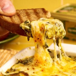 Backt den Dipp für ca. 20 Minuten, die Oberfläche goldbraun ist. Lasst den Dipp nur etwas herunterkühlen und genießt ihn mit geröstetem Sauerteigbrot, Baguette oder mit Crackern.