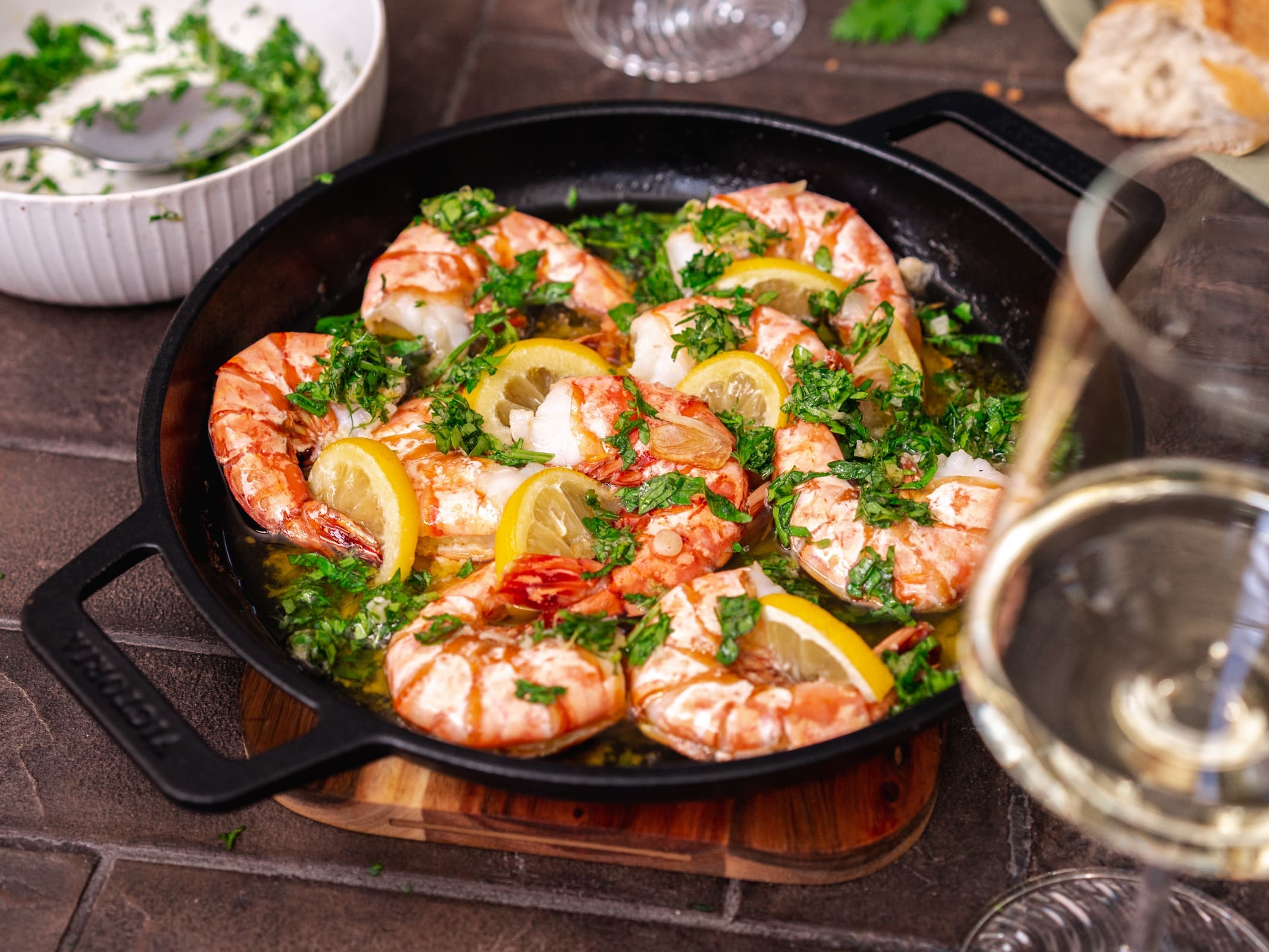 Für die Gremolata hackt ihr die Petersilie, presst den Knoblauch, reibt Zitronenschale dazu und vermischt alles mit Salz. Nehmt die Garnelen aus dem Ofen, bestreut sie mit Gremolata und genießt sie mit Baguette und einem Glas Quinta da Lixa.