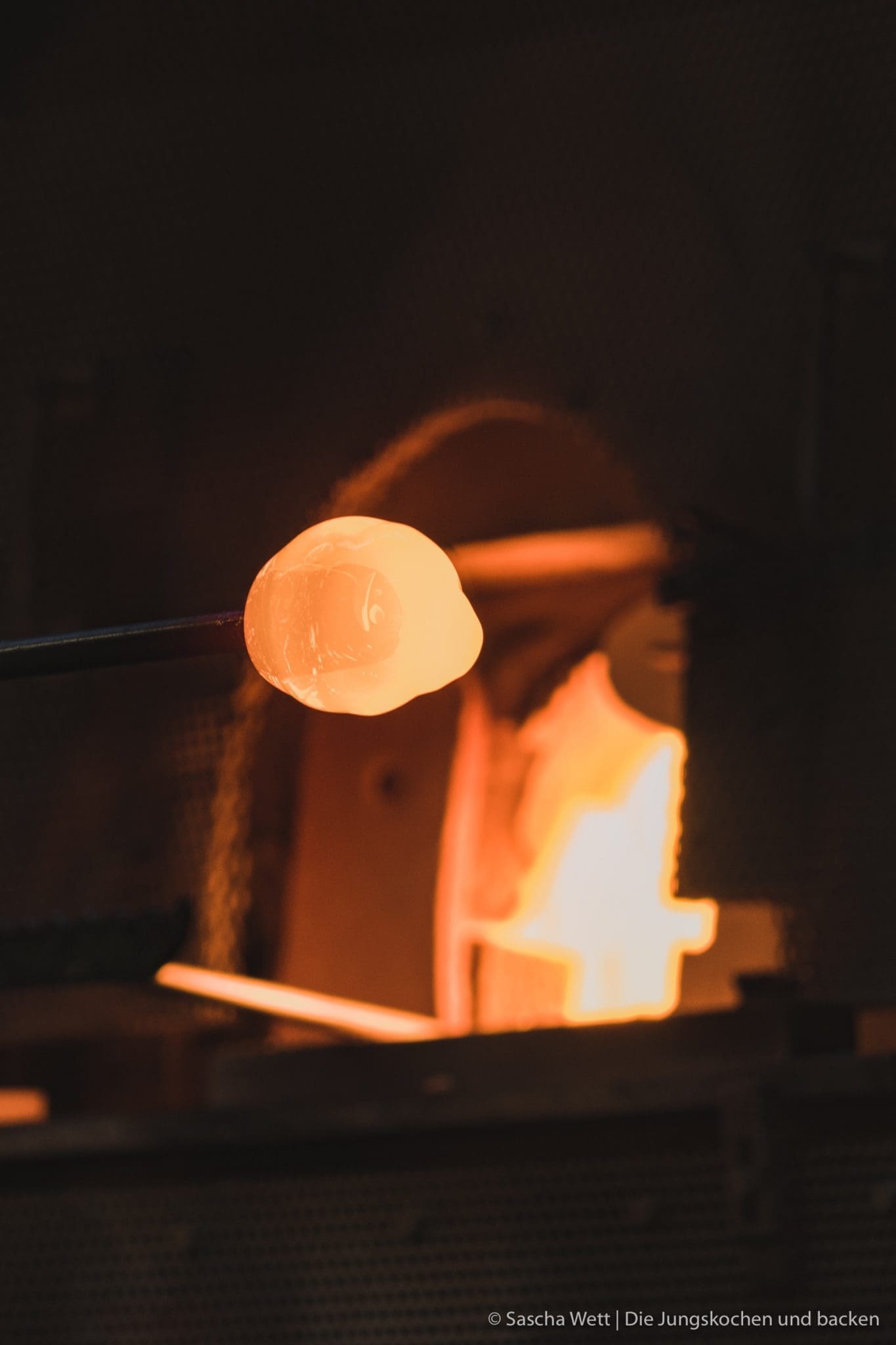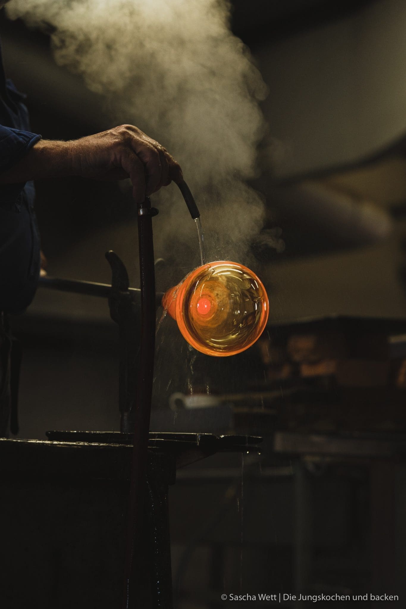 Diese Gourmetglas-Serien und alles, was dazu gehört, sind wahre Schmuckstücke auf dem Tisch. Schon beim ersten Berühren merkt wirklich jeder die enorme Qualität und Kunst dieser Gläser. Zum Beispiel erreicht man einen solch filigranen und feinen Stil nur von Hand! Aber was uns einfach umgehauen hat, ist die Präzision. Jedes Glas ist ein Einzelstück und trotzdem sehen alle gleich aus. Wir durften den Glasmachern zuschauen, die mit Holzformen aus eigener Herstellung arbeiten, aber letztlich alles weiter von Hand erarbeiten. Dass man mit dem bloßen Auge keinen Unterschied erkennt, ist wahres Handwerkskönnen.