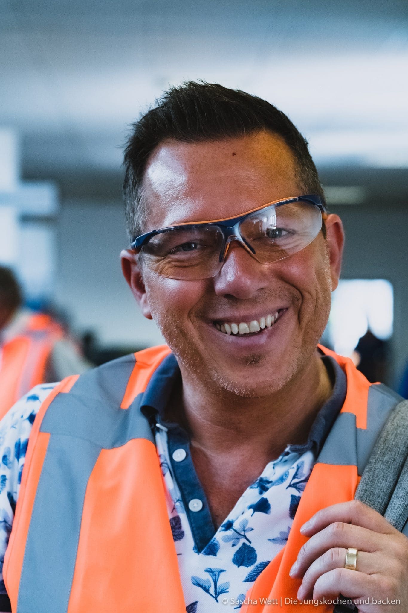 Solche riesigen Maschinenfertigungen sind irgendwie immer total überwältigend für uns. Wie jedes Rad in das nächste greift und diese perfekte Verkettung am Ende ein fertiges Produkt ergibt. Wie ihr euch denken könnt, geht es hier, wie auch schon bei den Glasmachern in der manuellen Fertigung, wirklich heiß her. Das flüßige Glas glüht mehr als eindrucksvoll und wir konnten sehen, wie aus diesem kleinen Ball, der wie Lava aussieht, am Ende ein großes Gin Tonic Glas entsteht. Ja genau – das Glas haben wir auch für unser Gurken-Gin Sorbet verwendet.